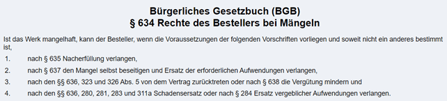 Die Gewährleistungsrechte des Bestellers ergeben sich aus § 634 BGB (bzw. § 13 Abs. 5, 6 und 7 VOB/B u.a).